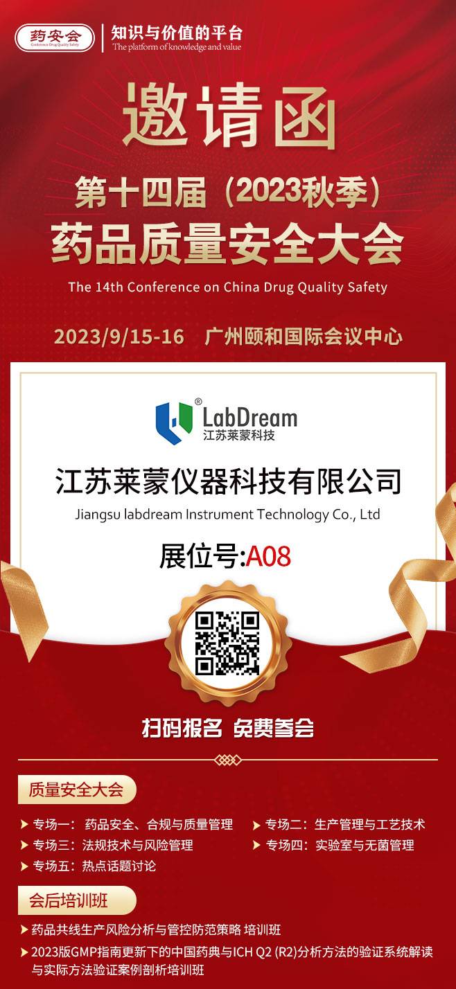 江蘇萊蒙誠邀您參加 第十四屆 (2023秋季) 藥品質(zhì)量安全大會 LABDREAM 聽行業(yè)大咖探討藥品安全,合規(guī)管理,生產(chǎn)及工藝技術(shù),實驗室及無菌管理,法規(guī)更新,風(fēng)險管理等熱門干貨話題! 萊蒙科技(A08)將首次攜最新流動相自動化產(chǎn)品樣機(jī)亮相展會,屆時更有豐富禮品贈送,歡迎各位老師蒞臨參觀!